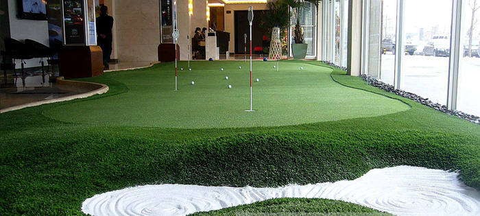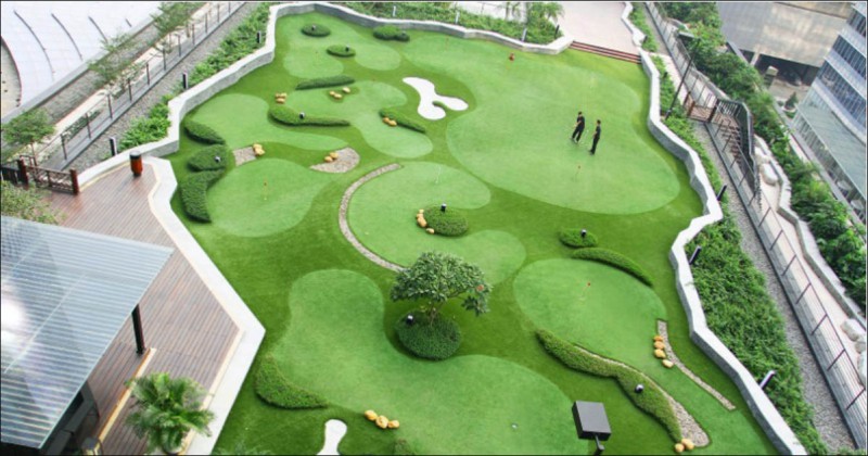 阳台景观高尔夫果岭(人工果岭)人造果岭完全按照仿生学原理生产,使其在球速、球感、脚感等方面的竞争力丝毫不逊于天然果岭。