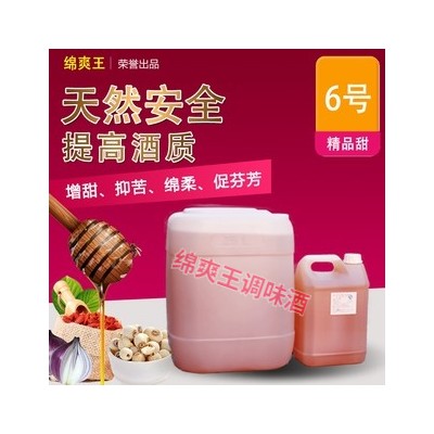 六号调味酒。绵爽王六号调味酒为微甜型调味酒,主要解决纯粮固态酒辣过头或甜度不足与微苦等问题。比三号、七号调味酒甜度低但自然。通常根据基础酒需要,一般用量在万分之三至万分之0.1%左右。