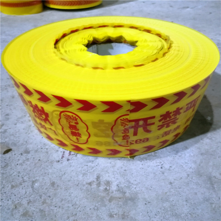 警示带有两种:一种为普通警示带;另一种为夹金属可探测警示带又称示踪带,(带不锈钢金属警示带),由于随着社会经济不断发展,地下管网建设中越来越多地采用PE、PPR、PVC等塑料管,探测仪器根本无法探测到管线走向,夹金属警示带可以解决管线无法探测这一难题,且该产品采用高强度、耐老化的高分子材料,以PE、PP、OPP为主要原料,经防腐处理加工而成,耐腐蚀性能好,色泽鲜艳、醒目,长期铺设在地下50年不腐蚀,不褪色,符合长期埋地质量不变要求。