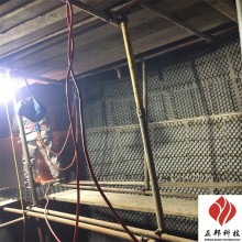 2.1根据烟道实际尺寸,先将金属网裁剪好。焊接时,将网紧紧贴靠管壁表面,并用木棍将网顶紧,不能留有空档及间隙。然后采用点焊方法焊接龟甲网,间距为×mm。焊接牢固,不能有松动或向外拱起弹动现象,以确保衬里材料涂抹上去后密实牢固。
