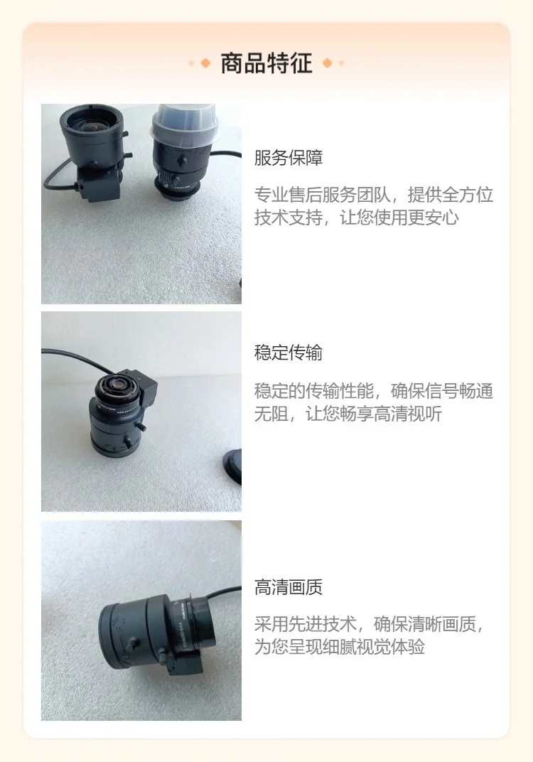 日夜两用、多种焦距、长焦点、DC自动光圈、金属接口、长电缆、ND滤光片、CS接口、非球面镜、大口径比、RoHS认证