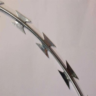 工艺:直线型刀片刺绳由热镀锌钢板或不锈钢薄板冲压出尖锐的刀片状,高张力镀锌钢丝或者不锈钢丝做芯线组合而成的阻绝器材。由于刺网造形不 易触摸,因而能达到的防护隔离效果。