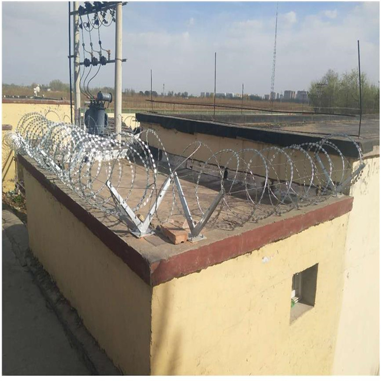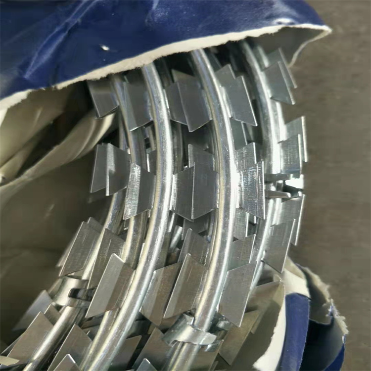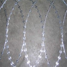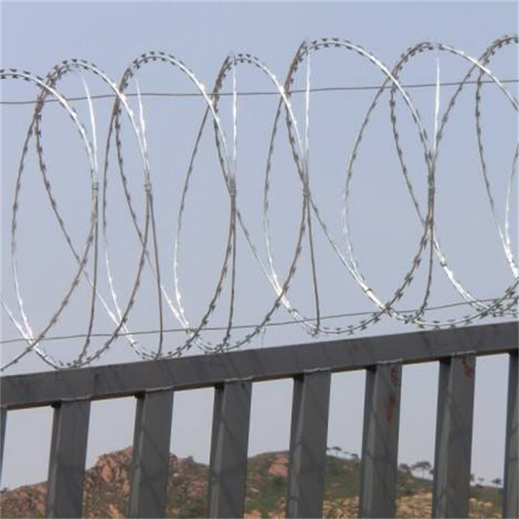 监狱防护网是一种隔离刀片刺绳。该产品具有吓阻效果好·美观·施工便利·经济实用等特点。监狱防护网由锐利尖角镀锌钢板或不锈钢薄板做刀片,高张力钢丝做芯线 组合而成的阻绝器材。由于监狱防护网造形不易触摸,因而能达到的防护隔离效果。