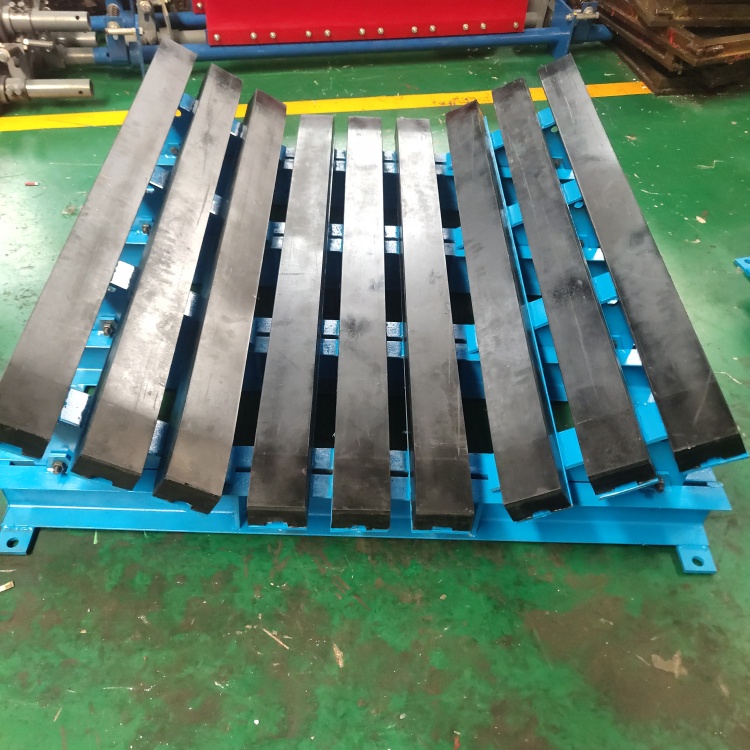 缓冲床主要用于替代缓冲托辊,缓冲床由缓冲条组成,而缓冲条主要应用优良的高弹性特种橡胶层充分有效吸收了物料下落时的冲击力,大大降低了物料下落时对输送带的冲击,真正的改善了落料点的受力状况。并采用特殊的UHMW高分子聚乙烯表面,使输送带与缓冲条之间的摩擦系数降低,且耐磨性好。缓冲床的使用保证了输送带的面与面的接触,受力均匀,有效防止了由于托辊断裂、脱落造成的皮带纵向撕裂,同时大大降低了皮带被锐器或尖锐物料穿透后纵向撕裂的概率