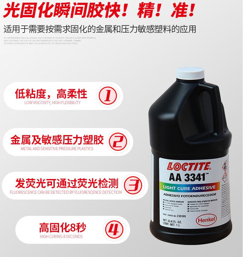 乐泰3341是一款UV/V固化的丙烯酸,对高柔性的PVC和其他难粘的基材有很好的粘结性,同时更具有良好的附着力,适用于一次性医 用装配设备。