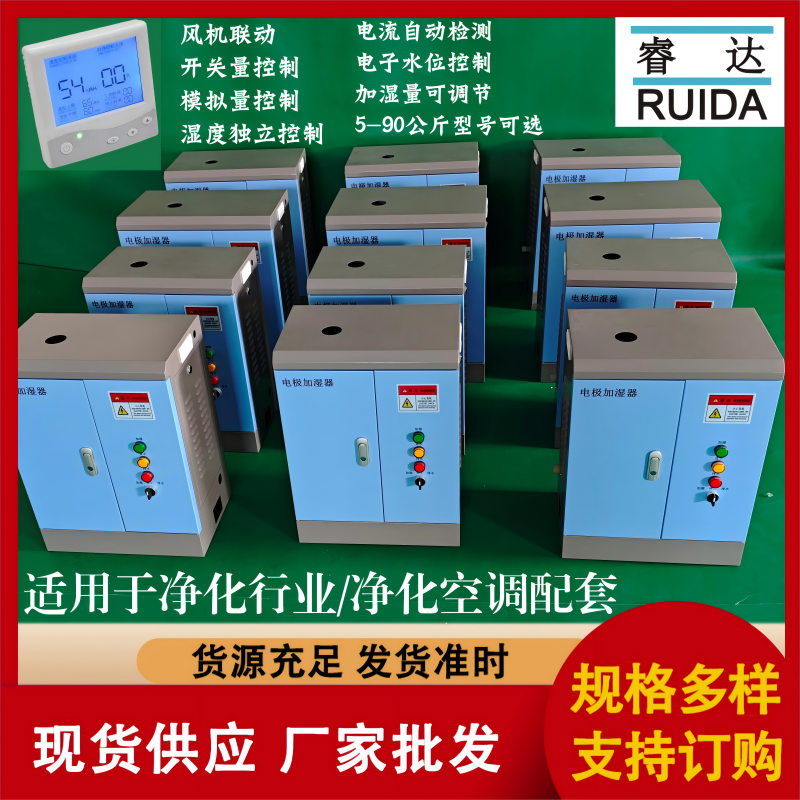 本公司电极式加湿器自配湿度控制器,也可选择开关量、模拟量、比例量远程控制,电极式加湿器适用行业:净化工程配套使用,净化空调配套加湿,洁净室,实验室用,大型空调机组用。电极式加湿器是洁净等温加湿,加湿均匀,蒸汽输出量在5-120kg/h可选。电极式加湿器结构紧凑,占用空间小,蒸汽加湿,主机外观设计美观大方,同时注重功能与配套的组合。洁净加湿安装紧凑.