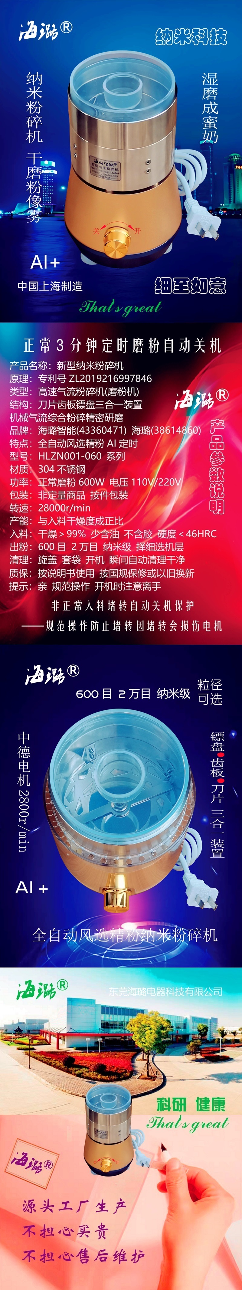 公司简介 东莞海璐智能电气有限公司荣誉出品智能纳米粉碎机。海璐智能纳米粉碎机设计科学,外形新颖,结构紧凑,使用方便。与同类产品相比,其制造精美、高速、精密地磨削功能好。海璐智能纳米粉碎机用于非金属材料的切割、研磨和均质;很是适合卫生、酒店、宾馆、家庭使用。制作食品饮料、调味品、化妆品等。海璐智能纳米粉碎机其智能机芯必将取代当今各种粉碎机。海璐智能纳米粉碎机助人类生活得更美好,家庭幸福,身体健康。欢迎各大媒体及朋友企业合作共赢!