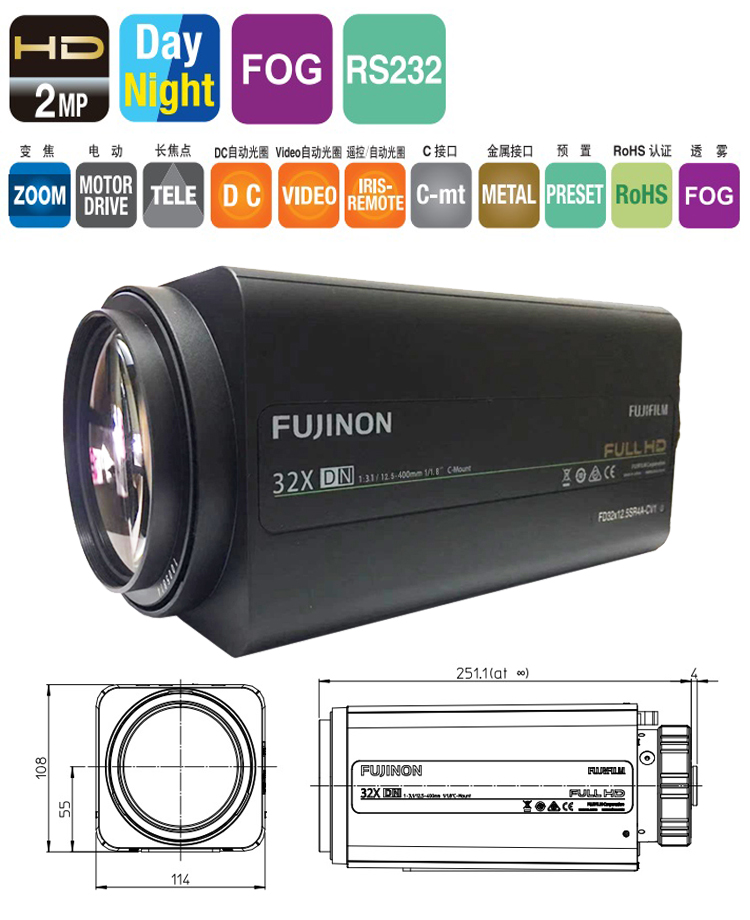 1.FUJINON Full-HD高清画质安防监控镜头 32倍的高倍率变焦镜头,可应对全HD,不仅用于1/2型、1/3、1/1.8型摄像器件,更可应对2/3型大尺寸摄像器件高清