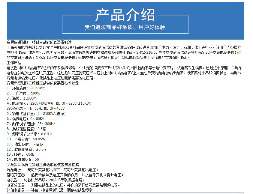 更新信息 快采购网供应商上海苏海电气有限公司供应SHXZ系列变频串联谐振成套装置,为您提供详细的产品报价、参数、图片等商品信息,本产品于2025-04-15 10:57更新,主要更新内容为:产品类别、产品参数、产品价格、产品图片等信息。如需进一步了解SHXZ系列变频串联谐振成套装置详细信息,请与厂家直接联系,并说明是在快采购网看到这条商机的。