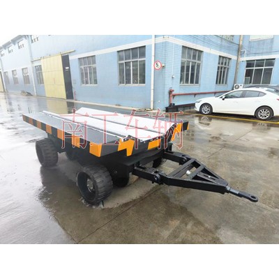 5.缓冲式牵引架有效缓解起步或制动时牵引车与平板车之间的冲击力,有效避免部件损坏,以及运载货物的碰撞与损伤,前排车轮左右回转角度为180度,大回转角度便于小半径转向,操作简单方便;