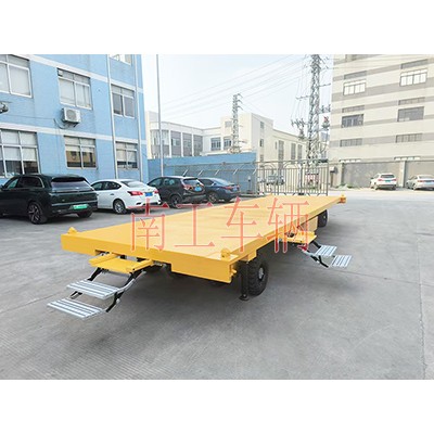 10吨移动拖车底盘 全挂式平板拖车南工车辆长期非标订制,平板拖车用于工厂、码头、港口、机场、仓库等场区短途周转运输,本款拖车带角锁,适用于各类箱体简易房车移动方舱运输。