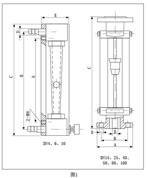 ![]() | SK-LZB/LZB-( )F流量计的锥管为光滑内壁管(见图4),通径DN15以上的流量计,浮子通过导杆 上下移动,保持稳定;SK-LZJ/LZJ-( )F流量计锥管 内壁有三条导向凸筋,使浮子保持稳定(见图4)。通径DN10以下的流量计采用软管连接,配有 针形流量调节阀;通径DN15以上流量计采用法兰连接。 |