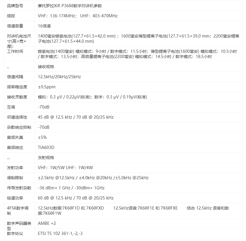MOTOTRBO™摩托罗拉XiR P3688 是一款满足行业及数据应用、高品质、高科技的专业数字对讲机,它秉承摩托罗拉对高品质的一贯追求结合现代科技。广泛应用于服务业、机场/港口、物业管理、仓库管理、超市管理、工厂等。
