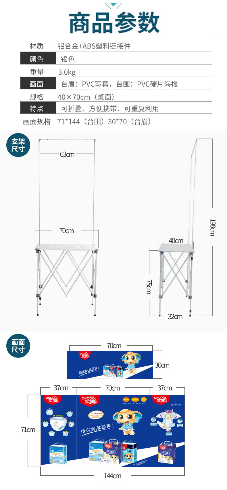 产品说明:此促销台为新开发产品,桌面和架体全部为铝合金材质,外表美观**,承重40公斤,收起来等同于易拉宝的大小